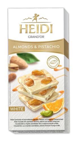 Heidi Grand'Or Ciocolata alba cu migdale caramelizate, fistic si portocala