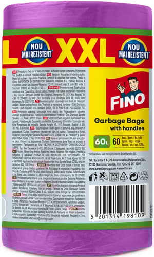 Sacii menajeri FINO PREMIUM HANDLES, cu mânere practice și aromă de fructe de pădure, reprezintă cea mai bună alegere fiind ușor de legat și transportat. Extra rezistenți datorită fundului cu structură stelată. De culoare mov. Ideali pentru coșurile de gunoi din bucătărie și birou. Dimensiunile sacului: 59x70 cm. Disponibili, de asemenea, în variantele de 10L, 20L, 35L și 60L, dar și în variante XXL de 35L.