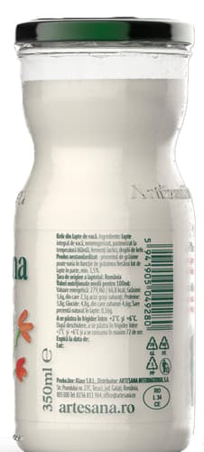 Lapte integral de vaca, neomogenizat, pasteurizat la temperatura joasa, fermenti lactici. Produs nestandardizat - procentul de grasime poate varia in functie de grasimea fiecarui lot de lapte in parte, min.3,5%.