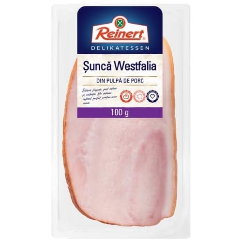 Frageda, cu o aroma consistenta, un gust unic si natural, sunca Westfalia iti va da toate motivele sa savurezi o masa delicioasa alaturi de cei dragi. Contine 97 % carne (pulpa de porc) si nu contine soia, gluten, coloranti artificiali sau potentatori de gust. Pentru o aroma optima va rugam sa desigilati pachetul cu 5 minute inainte de consum. A se pastra la o temperatura cuprinsa intre +2° si +7° C. The Family Butchers Romania Feldioara DN13 KM 11 , jud. Brasov