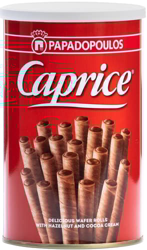 Grecia,Caprice este o combinatie unica de rulouri crocante de napolitana cu umplutura de cacao si alune care se topeste in gura si trezeste simturile! Asorteaz-o cu o cafea excelenta!