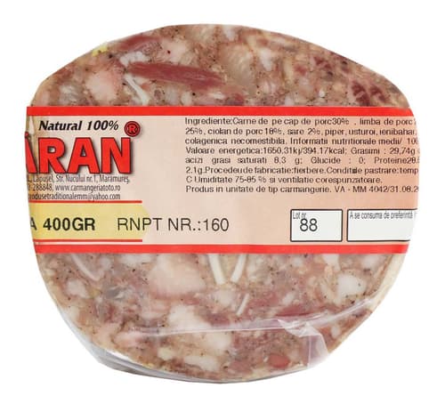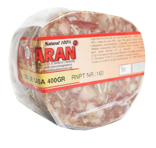 Valabilitate minimă garantată de la momentul livrării: 2 zile.Dacă valabilitatea minimă este mai mică decât cea menționată pe site, contactează-ne și solicită rambursarea sumei. Nu se aplică pentru articolele din secțiunea „Save Food”Amestec de carne de pe cap de porc 30%,sorici 25%,limba de porc 22%,ciolan de porc 18%,sare,piper,usturoi,ienibahar,nucsoara