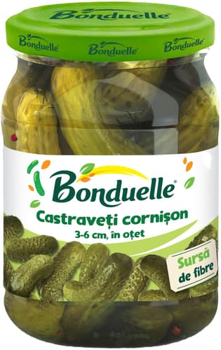 Castraveti cornison intregi, 3-6 cm, in otet, produs pasteurizat.