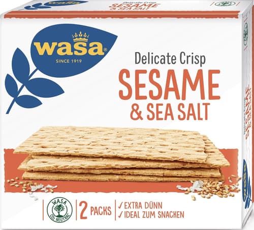 Wasa Delicate Crisp Sesame is an extra thin, crispy biscuit, baked from whole wheat flour. The taste of sesame and sea salt makes it a tasty cracker, which is rich in fiber.
