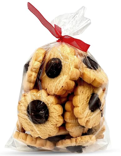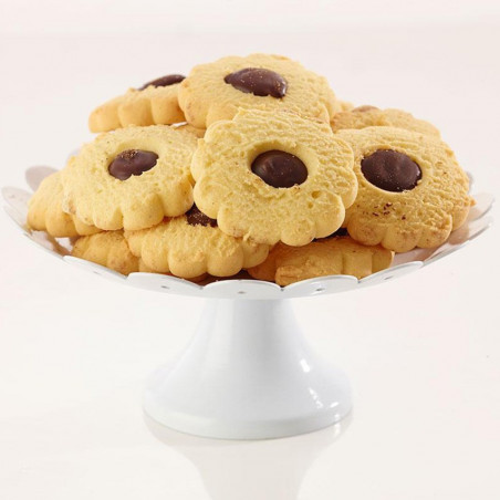 Biscuits made from white flour and corn flour, with butter, filled with cocoa cream.