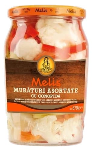 apa, conopida, morcovi, ardei grasi, castraveti, sare, ceapa, otet, ardei rosii, marar, corector de aciditate (acid citric), stabilizator (clorura de calciu), aroma, antioxidant (metabisulfit de sodiu)