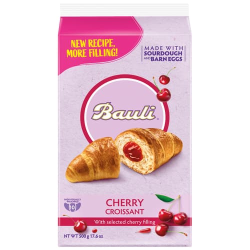 Croissant cu dospire naturala, cu umplutura cu cirese (25.5%). Ingrediente: faina de grau, uleiuri si grasimi vegetale (palmier, floarea-soarelui), zahar, maia (faina de grau, apa), sirop de glucoza-fructoza, pulpa de cirese (9.4%), oua din gaini crescute la sol (5.3%), drojdie de bere, lapte proaspat integral pasteurizat, emulgator: mono si digliceride ale acizilor grasi: sare, gelatinizant: pectina, arome, corector de aciditate: acid citric. Poate contine soia, fructe cu coaja, mustar.