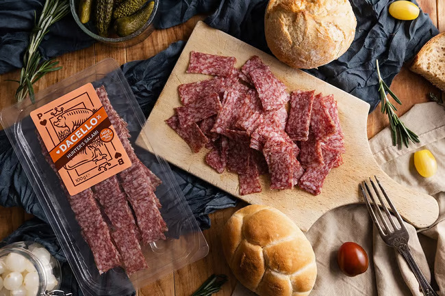 Salam vânătoresc Dacello tăiat în felii. Nu există salam ca salamul! Și când vă imaginați un astfel de salam vânătoresc, toți iubitorii de salam trebuie să saliveze imediat. Dar ce se întâmplă atunci, când salamul nostru vânătoresc Dacello apare în scenă - pur și simplu doriți să-l aveți în frigider.
