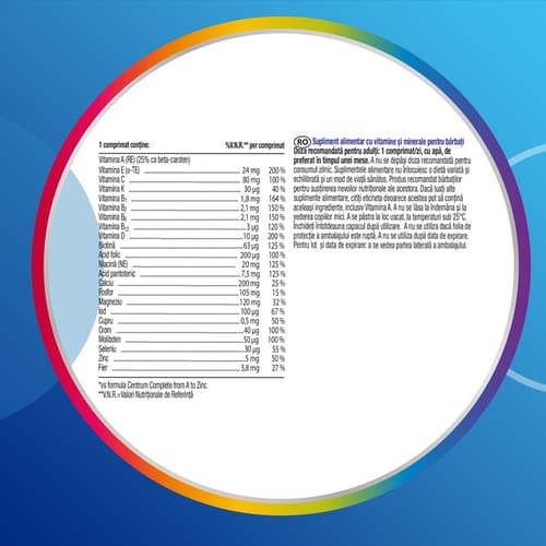 Centrum Men este un complex de multivitamine si minerale special creat pentru nevoile nutritionale ale barbatilor. Formula sa echilibrata sustine energia zilnica, sistemului imunitar, sistemul muscular si inima, pentru ca tu sa te bucura de sanatate si stare de bine in fiecare zi.