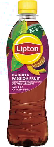 Non-carbonated refreshing drink with black tea extract and mango and passion fruit juice in 500ml pet packaging.