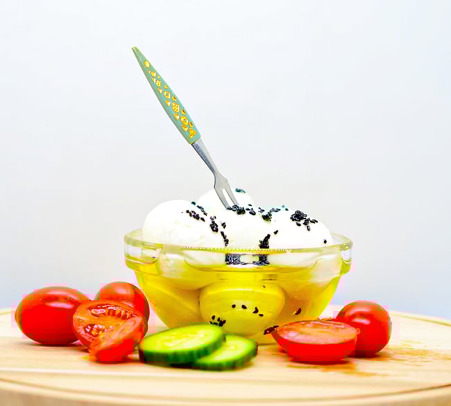 The intense creaminess of strained yogurt and shaped into spheres that blend perfectly with the unctuous extra virgin olive oil for a delight of the senses.
