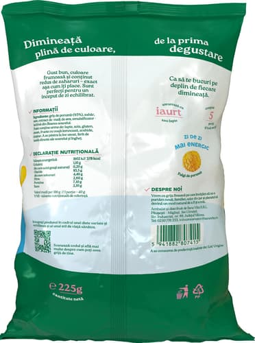 Griș de porumb (93%) (Origine UE), zahăr, sare, malț de orz, emulsificator - lecitină din soia.