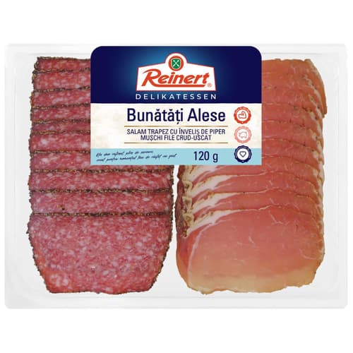 Two premium products - Trapez Salami with black pepper casing and Dry-cured Pork Loin - packed in the same tray, form the perfect combination for a pampering snack, easy to find on the shelf under the name Reinert BUNĂTĂȚI ALESE.