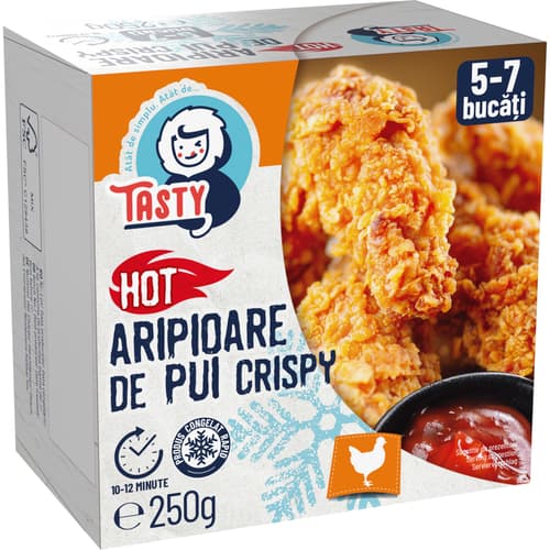 Tasty Hot Aripioare de pui crispy congelate250 gThis product is no longer available.Country: according to the current offerplease contact customer support for the exact information