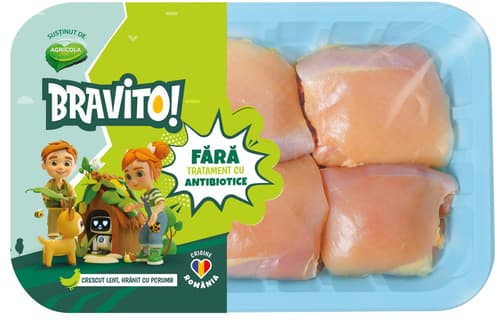 BRAVITO Skinless De-boned Chicken Thighs, sourced from free-range chickens, fed with corn, without antibiotic treatment during growth.