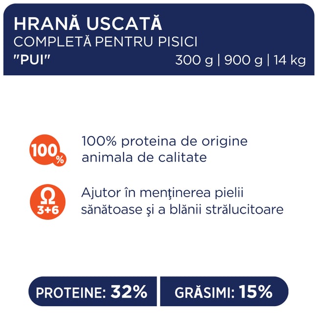 Hrana Premium uscata contine, in primul rand in compozitie, ingrediente din carne, precum si o formula speciala de crestere cu un continut ridicat de pui (26%) pentru o crestere sanatoasa in primele 12 luni de viata. Echilibrul fosforului, calciului si vitaminei D contribuie la formarea oaselor si articulatiilor sanatoase la pisoi. Complexul de acizi grasi nesaturati Omega 3 + Omega 6 mentine pielea sanatoasa si blana stralucitoare. Hrana este imbogatita cu inTEGRAMIX pentru sustinerea generala a sanatatii si imunitatii animalului de companie.