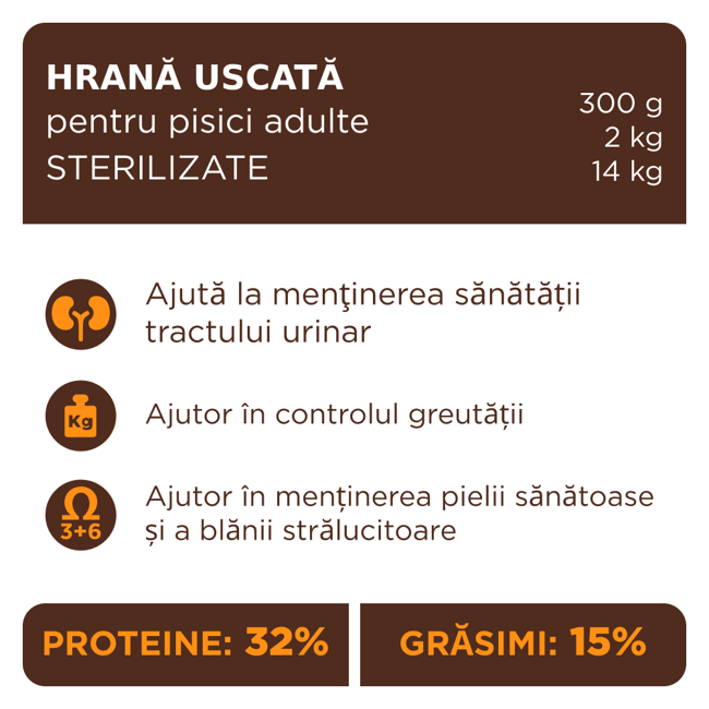 Hrana uscata Premium este elaborata pentru a satisface nevoile animalului dupa sterilizare sau castrare. Contine, in primul rand, in compozitie ingrediente din carne, din care 24% este pui, care are un coeficient ridicat de digestibilitate. Componenta echilibrata de proteine si grasimi (32/15), precum si calorii reduse, contribuie la mentinerea greutatii optime a pisicii. DL-metionina este un aminoacid esential care regleaza metabolismul, contribuie la sanatatea rinichilor si favorizeaza repararea celulelor hepatice. Echilibrul special de Ca, P si Mg asigura prevenirea urolitiazei datorita reducerii cristalelor de sare in urina.