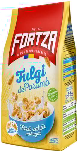 Corn Flakes without added sugar / Traditional product obtained by extrusion from 100% Romanian Corn Grits. The original Fortza cereals have been fueling Romanians' mornings with good energy since 1971! Crunchy and rich in vitamins and iron, they have a taste that you will love. Over time, the famous skater figurine continues to be present on the packaging, symbolizing pure energy! The TITAN factory in Bucharest is where the corn flakes are produced, and all our experience and quality can still be found in each of these Fortza corn flakes!