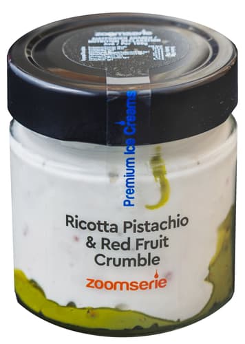 Zoomserie Inghetata Ricotta cu fistic si fructe rosii maruntite in borcan