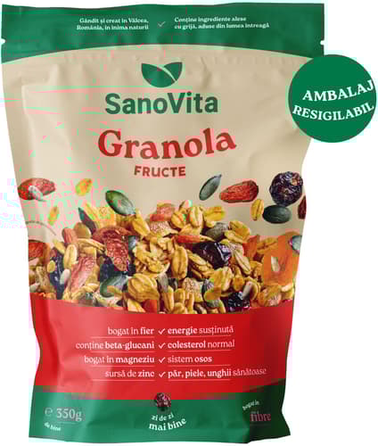 Fulgi de ovaz integral* 41%, fructe 20% (caise uscate (caise, conservant-dioxid de sulf, merisor confiat (merisor, concentrat din suc de mere, ulei de floarea soarelui), goji uscat), sirop de curmale, fulgi de orz integral, ulei de cocos, seminte de floarea soarelui 4%, seminte de dovleac 4%, sirop de artar, oligofructoza, faina de orz, sare.