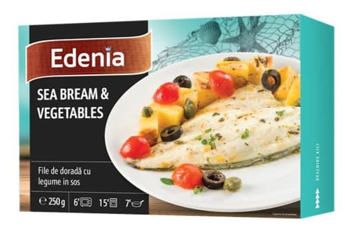Legume 52% (cartofi la gratat si rosii cherry in proportii variabile), file de DORADA 32%, sos 11.2% (apa, uleide masline extravirgin, suc de lamaie, sare, agent de ingrosare: guma guar; cimbru 0.7%, piper), masline negre 2.8% (masline negre, sare, stabilizator; gluconat feros), capere 2% (capere, sare).