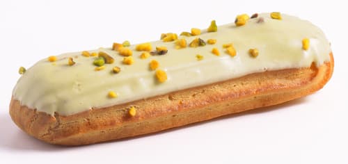 Aluat oparit de eclere, crema de lapte cu pasta de fistic si glazura de ciocolata alba belgiana si extract de vanilie bio.