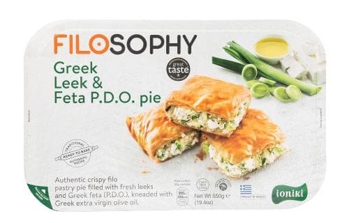 Aluat 60% :faina, apa, mix de ulei vegetal din (porumb,tescovina de masline, floarea soarelui si extravirgin de masline) sare, dextroza. Umplutura 40% : praz-39%,urda-17%,gris de grau,branza feta PDO-9%,apa,ceapa,oua pasteurizate, mix de uleiuri de porumb,tescovina de ulei de masline si virgin de masline si floarea soarelui),marar,amidon modificat,ulei de masline extravirgin-1%,sare, piper negru.