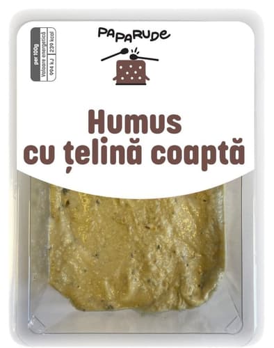 Discover a hummus like no other: with roasted celery, fine, aromatic, and full of character. PAPARUDE combines creamy chickpeas with the subtle sweetness and slightly spicy aroma of slow-roasted celery, for a velvety texture and a surprisingly refined taste. A plant-based product, without preservatives or additives, created for those who want more from a healthy snack.