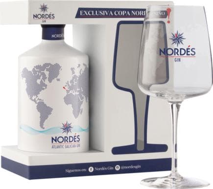 Nordes gin stands out through the use of Albarino grapes, specific to the region, and a blend of 11 botanicals, including lemongrass, eucalyptus, mint, and hibiscus. Its taste is fresh, floral, and slightly fruity, differing from traditional juniper-dominant gins. The glass included in the set is specially designed to highlight the gin's aromas, offering a complete tasting experience.