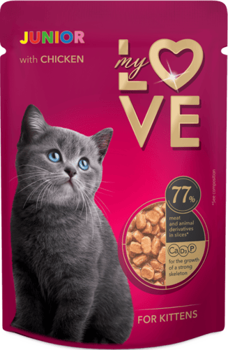 Ingredients: meat and animal derivatives (pieces in proportion of at least 77 %), including chicken meat at least 8 %, cereals (wheat 6 %), vegetable protein extracts, minerals, derivatives of vegetable origin (parsley) 0.001 %.