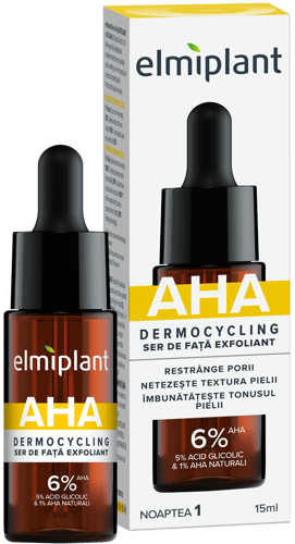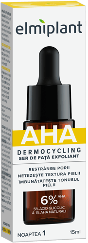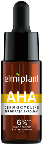 elmiplant Ser de Fata EXFOLIANT cu 6% AHA (5% Acid Glicolic si 1% AHA naturali), indeparteaza celulele moarte de pe suprafata pielii, restrange si minimizeaza porii si reduce imperfectiunile. Pentru toate tipurile de piele.