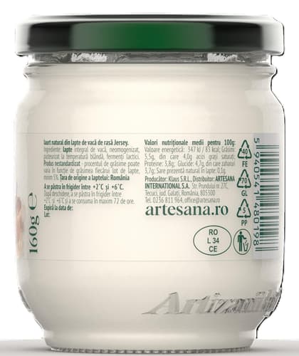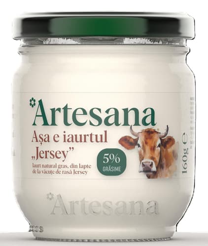 Noul iaurt „Jersey” de la Artesana conține 5% grăsime naturală, provenită exclusiv din laptele de la vaci din rasa Jersey. E un lapte recunoscut pentru calitatea superioară, bogat în grăsime și proteine.