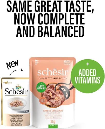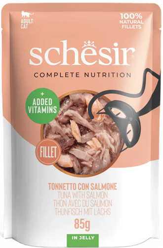 Hrana umeda pentru pisici Schesir plic cu ton si somon in jeleu 85 g este o hrana completa umeda pentru pisici adulte, cea mai buna recomandare pentru pisici, in conformitate cu dieta lor naturala si nevoile de hidratare ale felinelor; Noua reteta contine aditional vitamine si minerale.