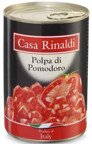 100% Italian chopped tomatoes Casa Rinaldi. Made from peeled tomatoes cut into cubes and immersed in tomato juice, it is a product with a sweet and delicate taste, and an intense red color. The tomatoes used are firm, retaining their taste and consistency even after slow and prolonged cooking. Our pulp comes exclusively from raw materials from certified cooperatives.
