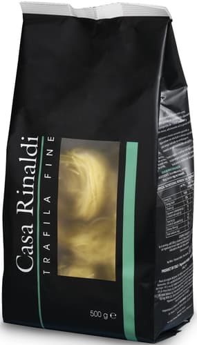 Casa Rinaldi pasta represents the ultimate Italian tradition and experience. Each shape is produced using the ancient method of bronze drawing: this is a process in which the dough, made from durum wheat flour and water, is extruded through bronze dies, giving the pasta its rough texture and consistency. Subsequently, a series of blades cut the product according to the desired length. This is followed by the drying phase, which is carried out slowly and at low temperatures. Casa Rinaldi Capellini No. 40 have a delicate aroma and taste. It is a long and very thin pasta, which nevertheless perfectly maintains its structure. It is a smooth and light-colored pasta. Casa Rinaldi Capellini should be boiled in salted water according to the time indicated on the packaging, and to appreciate their delicacy, we recommend a simple recipe based on truffles, tomato sauce, or a vegetable or meat ragu. They are also ideal for enjoying in soups and broths. Our bronze-drawn pasta is rough, opaque in color, with a delicate aroma and taste. It remains slightly "al dente", and its consistent texture allows it to easily retain the sauce used for seasoning.