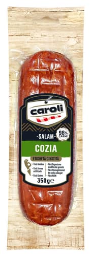 Salamul Cozia 350g Caroli este pentru cei care isi doresc mai mult: mai multa carne, mai mult gust, fara compromisuri. Cu 98% carne de calitate superioara si o reteta simpla, Cozia face parte din gama superioara Caroli. Gustul intens, ambalajul modern si Eticheta Cinstita – fara gluten, fara amidon, fara MDM, fara monoglutamat adaugat, fara arome artificiale si fara organisme modificate genetic – ofera tot ce ai nevoie pentru mesele de zi cu zi.