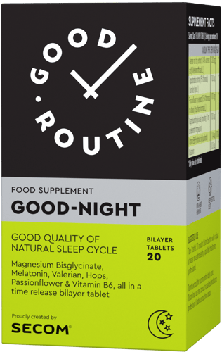 In the form of innovative double-layer tablets, it supports sleep quality (through the synergy between Melatonin and standardized extracts of Passiflora, Valerian & Hops) and the proper functioning of the nervous system (through the association of Magnesium bisglycinate and Vitamin B6).