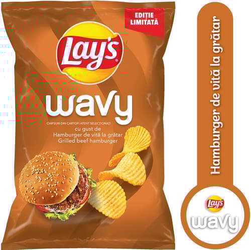 Deschide Lay's. Savureaza fiecare zi! Lay's Wavy. Chipsuri ondulate, din cartofi atent selectionati, cu aroma de burger. Atat de crocante si delicioase!