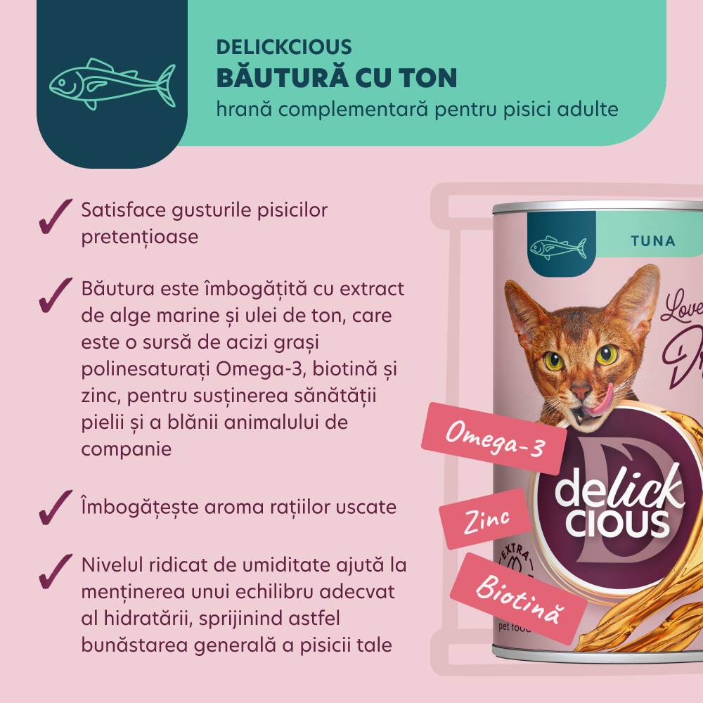 Tonul preferat intr-un nou format delicios — aceasta bautura completeaza optim alimentatia zilnica a pisicii. Pestele nutritiv si nivelul ridicat de umiditate asigura atat un plus de energie, cat si restabilirea echilibrului hidric, oferind o adevarata placere culinara. Creat cu dragoste din ingrediente naturale pentru pisici sanatoase si fericite. Completeaza perfect hrana uscata, pentru a savura fiecare granula. Delickcious nu e doar hrana, ci wow-deliciі! Avantaje: ☑ Satisfac gusturile pisicilor pretentioase ☑ Bautura este imbogatita cu extract de alge marine si ulei de ton, care este o sursa de polinesaturate acizi grasi Omega-3, biotina si zinc pentru a sustine sanatatea pielii si blana stralucitoare a animalului. ☑ Imbunatateste proprietatile gustative ale ratiilor uscate ☑ Nivelul ridicat de umiditate contribuie la mentinerea echilibrului hidric pentru bunastarea pisicii