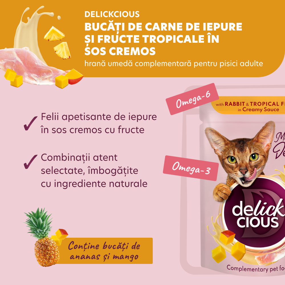 Delickcious Fulgi de carne de iepure cu fructe tropicale in sos cremos hrana umeda pentru pisici adulte