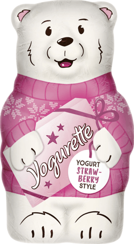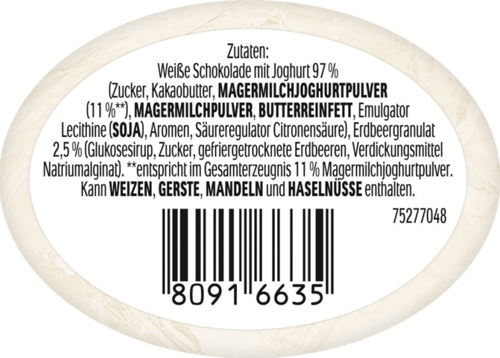 Ciocolată albă cu IAURT 97% (zahăr, unt de cacao, iaurt pudră din LAPTE degresat (11%**), LAPTE praf degresat, UNT, emulgator lecitine (SOIA), arome, regulator de aciditate acid citric), granule de căpșuni 2,5% (sirop de glucoză, zahăr, căpșuni liofilizate, agent de îngroșare alginat de sodiu). **Echivalent cu 11% iaurt pudră din LAPTE degresat în produsul total. Poate conține GRAU, orz, MIGDALE si ALUNE DE PADURE.