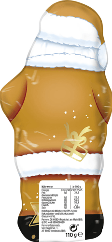 Zahăr, LAPTE praf degresat (17,5%), grăsimi vegetale (palmier, shea), UNT de cacao (11%), LAPTE praf integral (9%), UNT concentrat, caramel cu LAPTE 1% (LAPTE praf degresat, ZER dulce, zahăr, UNT concentrat, aromă naturală de vanilie), masă de cacao, emulgator: lecitine (SOIA), sare, arome. Conținut total de substanță uscată din LAPTE: 32%.