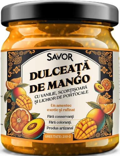Un preparat artizanal, fara aditivi sau conservanti, ce combina dulceata mango-ului copt cu finetea lichiorului de portocala si a mirodeniilor naturale.