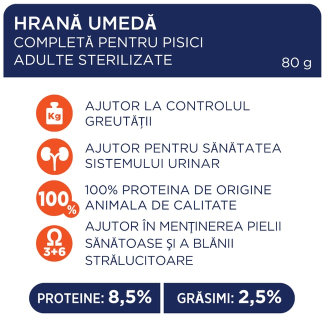 Hrană umedă premium ce conține 77% ingrediente din carne și pește în fiecare bucată, dintre care 9% somon. Este îmbogățită cu complexul Omega 3 + Omega 6 pentru piele sănătoasă și blană strălucitoare și formula INTEGRAMIX pentru susținerea generală a sănătății animalului dumneavoastră.