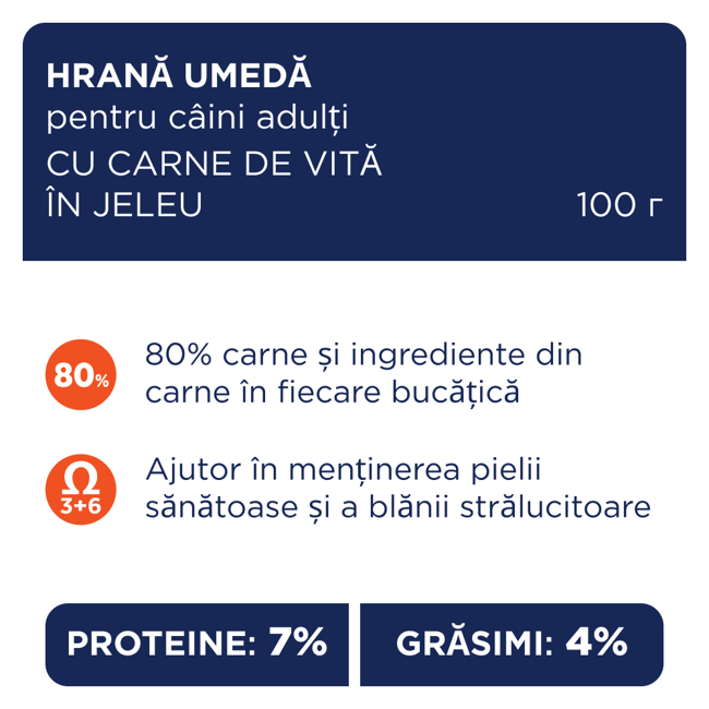 Hrană umedă premium ce conține 80% carne și ingrediente din carne în fiecare bucată în jeleu apetisant, delicioasă pentru câinii de rase mici cu greutatea de până la 10 kg și vârsta de peste 1 an.