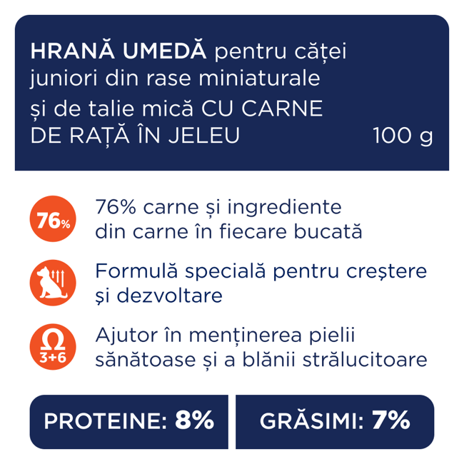 Hrană umedă premium pentru căței de toate rasele, ce conține 73% ingrediente din carne în fiecare bucățică și o formulă specială de creștere. Are un conținut ridicat de pui (25%) pentru o dezvoltare sănătoasă în primele 12 luni de viață.