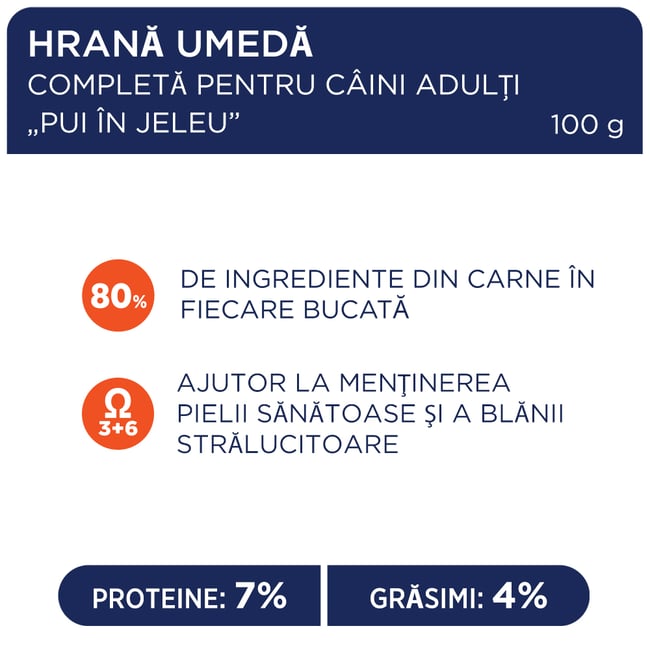 Hrană umedă premium ce conține 80% carne și ingrediente din carne în fiecare bucată în jeleu apetisant, delicioasă pentru câinii de rase mici cu greutatea de până la 10 kg și vârsta de peste 1 an.
