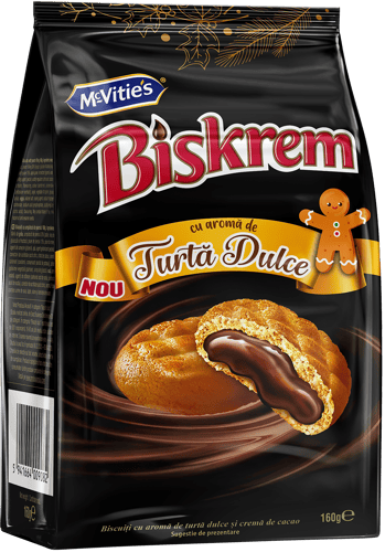Biscuiții Biskrem cu aromă de turtă dulce oferă o combinație delicioasă de textură crocantă și umplutură de cremă de cacao (30%). Sunt ideali pentru a fi savurați alături de o cafea, ceai sau băutură răcoritoare.