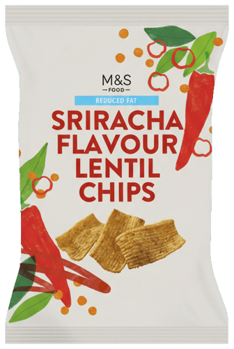 Chipsurile de linte cu aroma de Sriracha de la Marks & Spencer sunt o alegere delicioasă pentru iubitorii de gusturi picante. Preparat din faina de linte, acest produs este condimentat cu un amestec de ardei iute uscat, sos Sriracha și rosii coapte la soare.