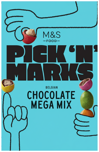 Our Pick 'n' Marks Belgian chocolate mega mix brings a captivating assortment of treats covered with colourful sugar shells. Discover milk chocolate pieces alongside crispy rice puffs and peanuts, all covered in smooth Belgian chocolate.
